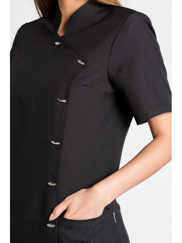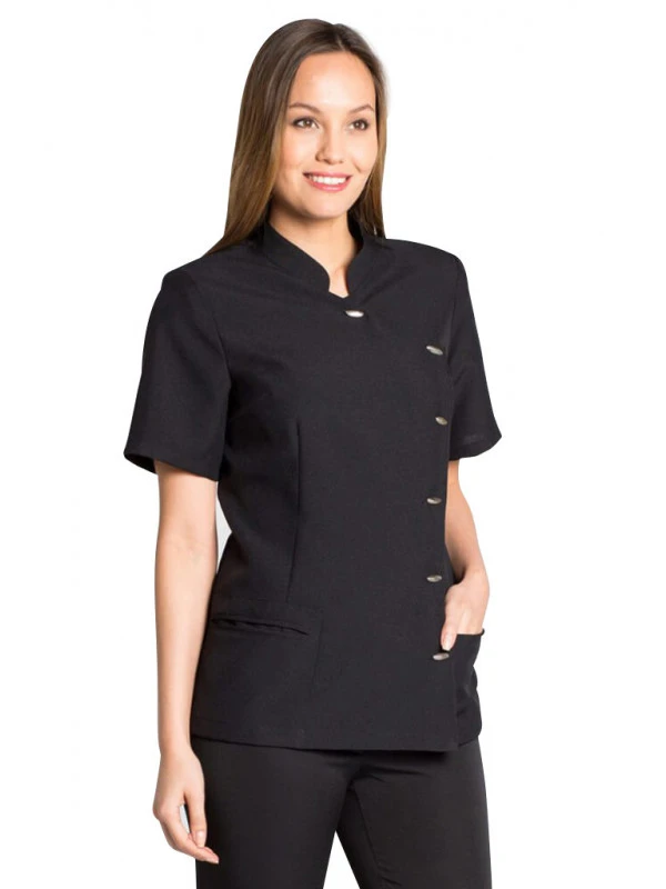 Cette tunique d’esthéticienne est sans conteste la plus féminine des tenues de travail pour femme. On adore son boutonnage asymétrique et son col officier. L’élégance au travail pourrait être le slogan de cette blouse noire d’esthéticienne.