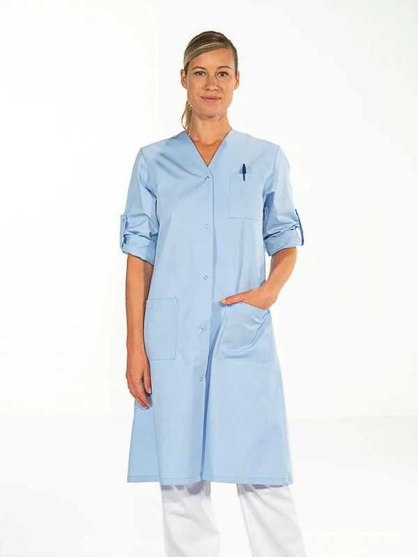 Cette blouse de travail féminine se ferme à l’aide de boutons pressions cachés. Cette blouse professionnelle pour femme peut être portée pour différentes professions dans les domaines du médical et paramédical. Les manches longues possèdent des pattes de relevage, permettant de porter votre tenue également en manches courtes. Le cintrage doux et féminin de cette tenue de travail vous rend féminine et élégante au travail. Cette blouse de travail bleu clair dispose d’une découpe facilement adaptable à toute morphologie. Peut se porter avec ou sans pantalon.