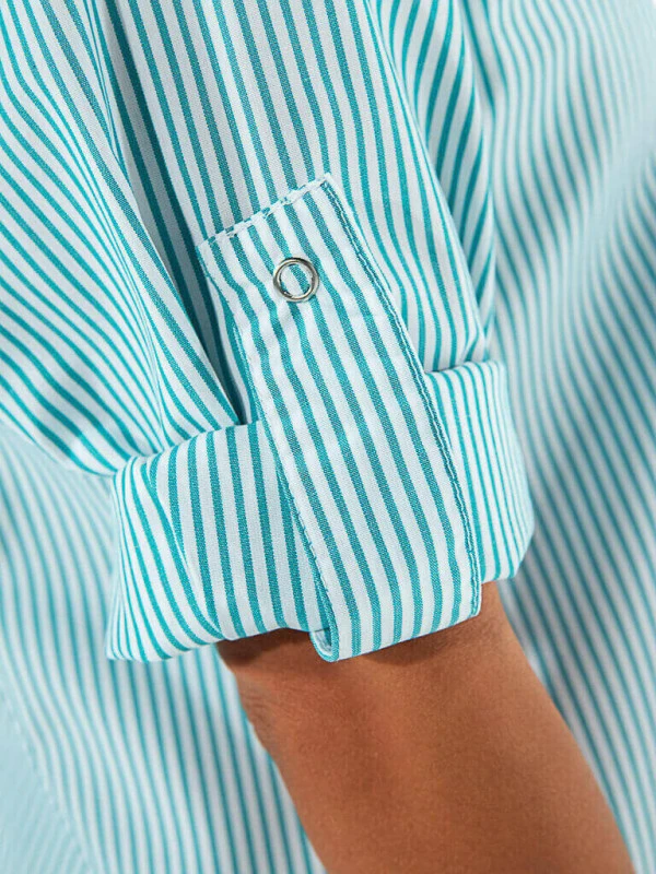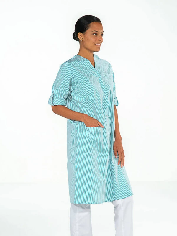 Cette blouse de travail élégante se ferme à l’aide de boutons pressions cachés. Cette blouse de travail pour femme peut être portée pour différentes professions dans le domaine de l’entretien, telle qu’une blouse agent de nettoyage, blouse agent de propreté, blouse femme de ménage hospitalier. Les manches longues possèdent des pattes de relevage, permettant de porter votre tenue également en manches courtes. Le cintrage doux et féminin de cette tenue de travail vous rend féminine et élégante au travail. Cette blouse de travail rayée dispose d’une découpe facilement adaptable à toute morphologie. Peut se porter avec ou sans pantalon.