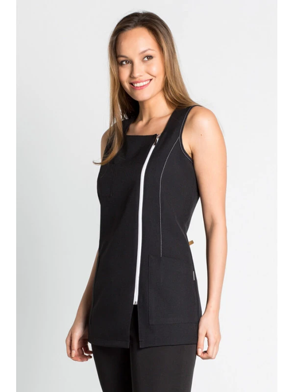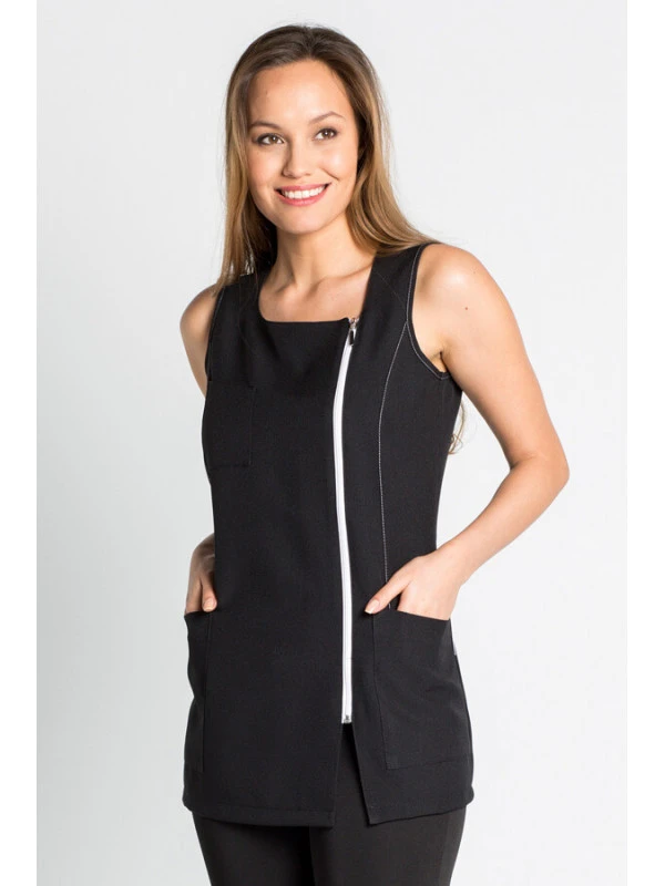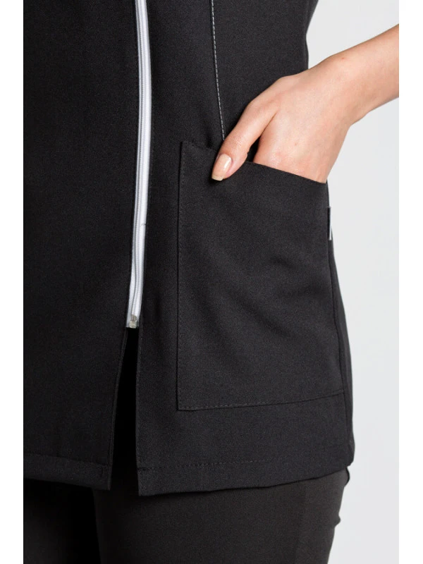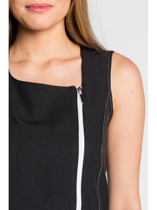 Tunique noire à glissière avec fermeture éclair, faite pour le commerce quelqu’il soit et l’esthétique. Son encolure est asymétrique avec une fermeture à glissière latérale avec coutures assorties.