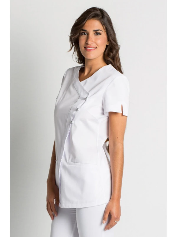 Ce vêtement professionnel d’esthetique cintré, épousant délicatement la silhouette et mettant en valeur la forme et les atouts féminins est la tenue qui convient aux professionnelles qui exercent dans ce domaine. Sa découpe en forme de cache-c?ur ainsi que sa fermeture sur le côté accentue le style tendance de cette tenue de travail. Ce modèle est parfait pour les esthéticiennes professionnelles qui doivent être les premières à véhiculer la beauté. Ses manches courtes avec fente et sa longueur respectent le code et la charte exigés des blouses d?esthéticiennes professionnelles. Cette blouse est aussi l’une des meilleures tenue etudiante en esthetique.
