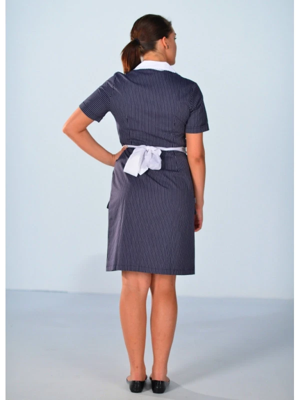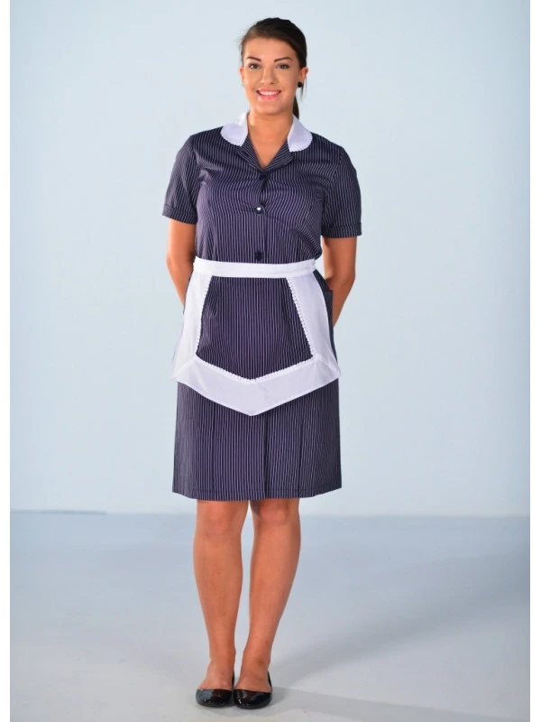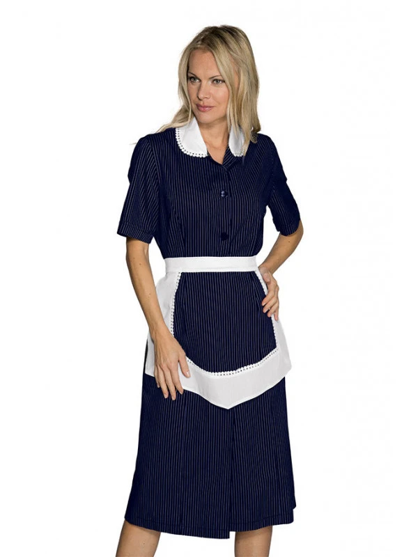 Traditionnelle et moderne à la fois, cet ensemble blouse et tablier pour le personnel d’entretien possède un col claudine finition dentelle et des ornements blancs contrastant sera l’uniforme idéal pour le personnel d’étage, d’un établissement hôtelier