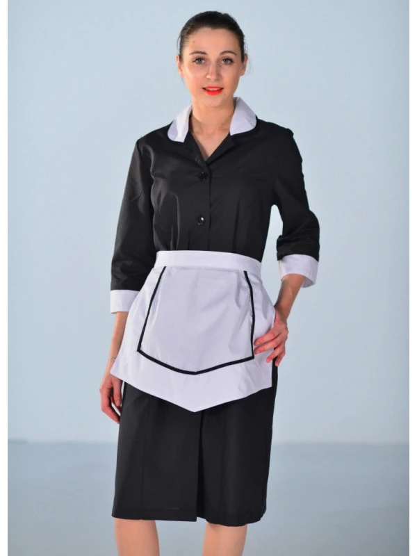 Cet ensemble dans le style Robe chemiser offre un style contemporaine avec son joli tablier blanc, ses boutons et son col claudine blanc. Cette blouse possède également deux poches sur le devant. Composition: 65% polyester, 35% coton pour le confort et la respirabilité. Cette tenue tablier + blouse de femme de chambre est également disponible en manches courtes