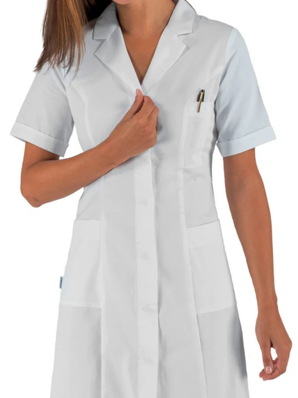 Idéale pour les métiers du médical, infirmière, femme médecin, en laboratoire, cette blouse de travail blanc 100 % coton manches courtes vous offre confort tout au long de votre journée de travail. Elle possède deux poches sur les hanches et une poche sur la poitrine. Le boutonnage pression permet une fermeture et ouverture rapide. La coupe du modèle légèrement évasée marque la taille afin de donner une touche de féminité au modèle. Un petit col marque le professionnalisme de la tenue.