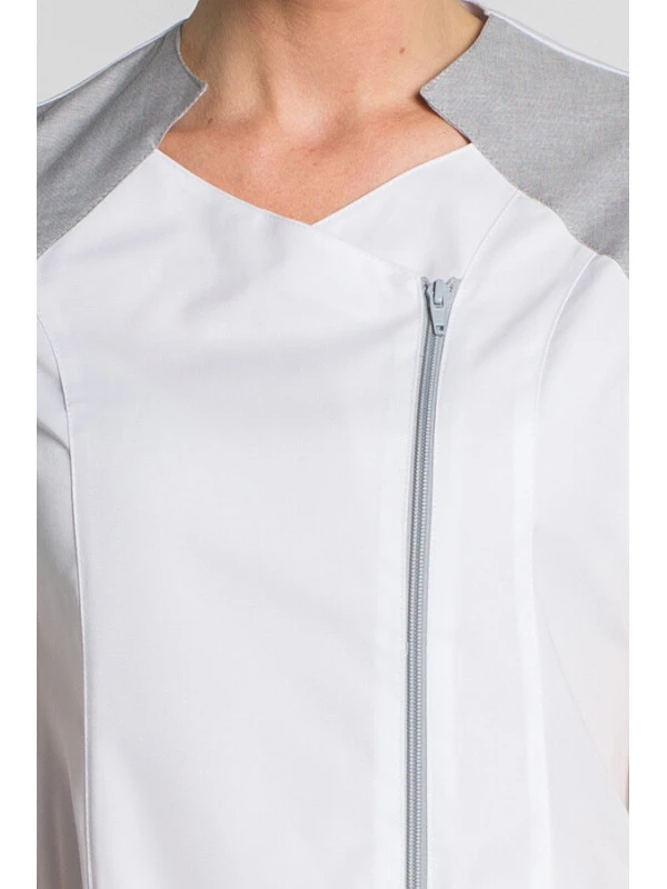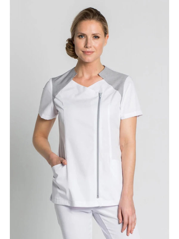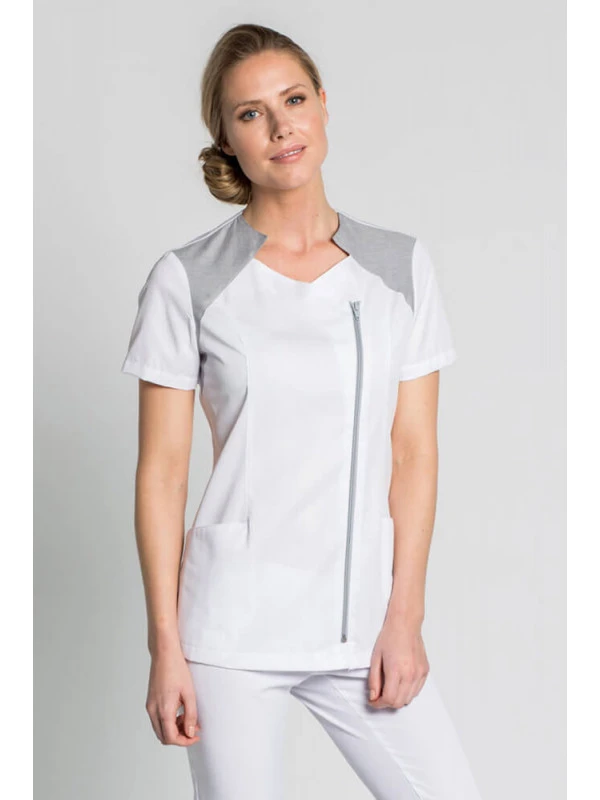 Cette tunique médicale apportera une touche de classe, d’élégance et de modernité à votre tenue professionnelle grace à sa fermeture éclair horizontale sur le devant et son col gris.