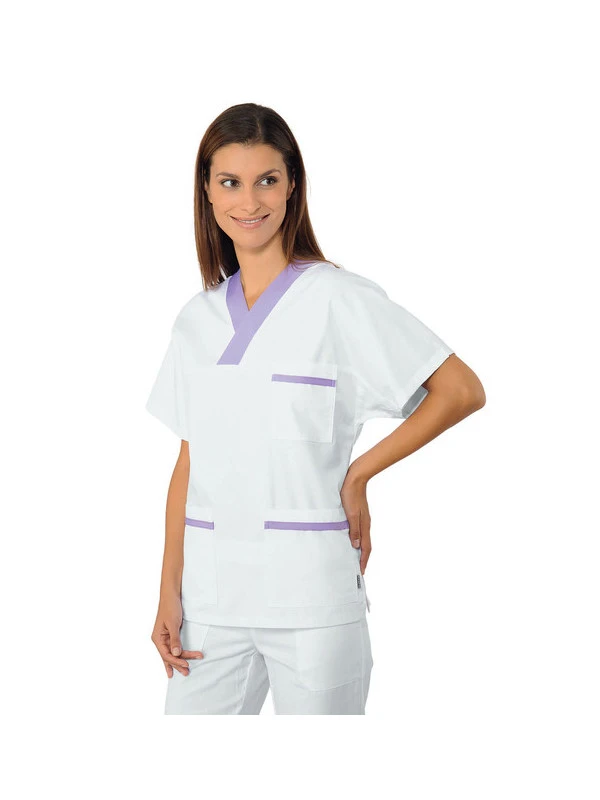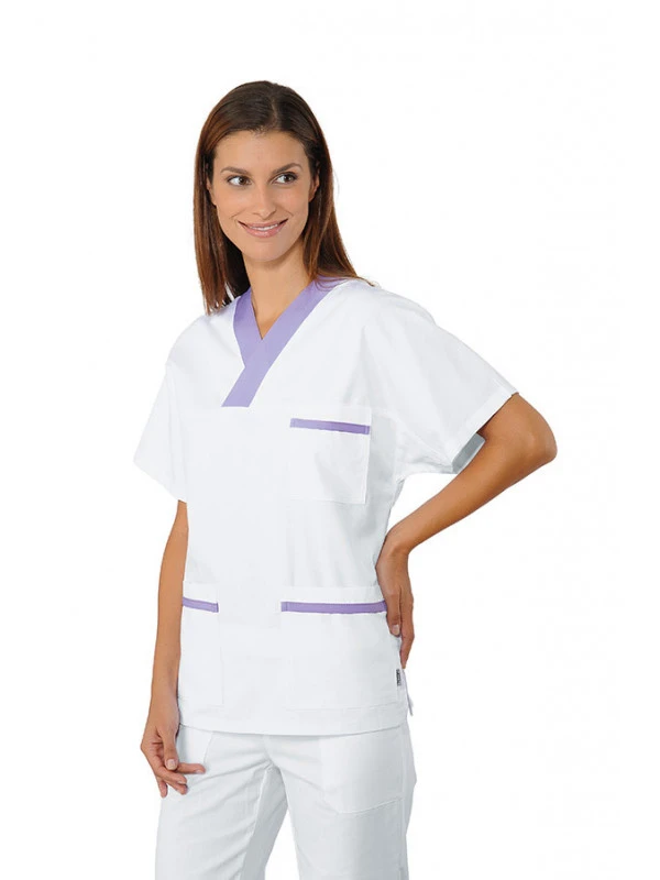 Casaque Médicale Col en V 100% Coton Unisexe Blanc Lilas