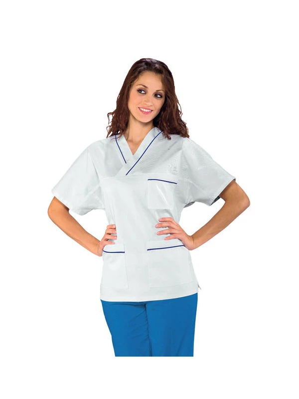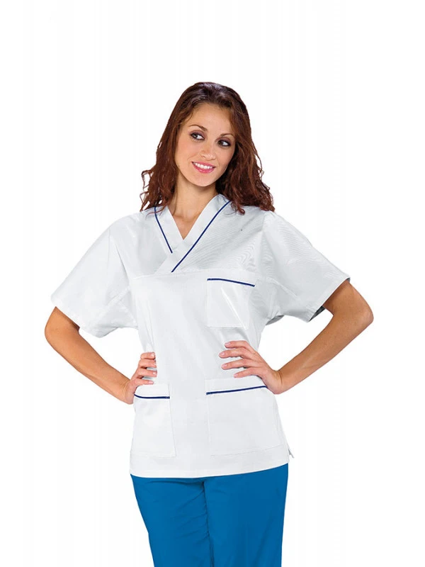 Casaque Médicale Col en V 100% Coton Unisexe Blanc profilo Bleu Cyan