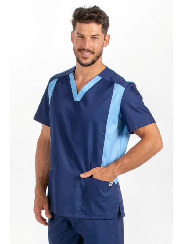 Cette tunique médicale manches courtes homme est à la fois professionnelle par sa coupe classique avec encolure en V avec 2 poches, et moderne son double coloris bleu clair et bleu foncé.. Cette tenue professionnelle médicale impérmébale est légère est très confortable, vous ne pourrez plus vous en passer. Elle est conçue en microfibre imperméable associée à un tissu technique anti-bactérien et respirant sur les côtés. On apprécie sa douceur au porté.
