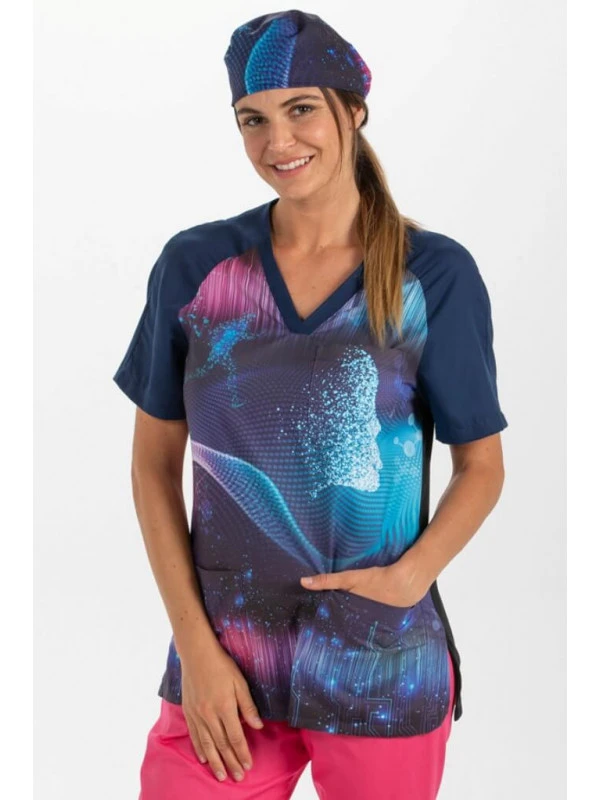 Cette tunique médicale à motifs est à la fois professionnelle par sa coupe classique avec encolure en V, et moderne par ses motifs originaux. Ce vêtement professionnel médical est mixte, se portant aussi bien pour les femmes que pour les hommes.