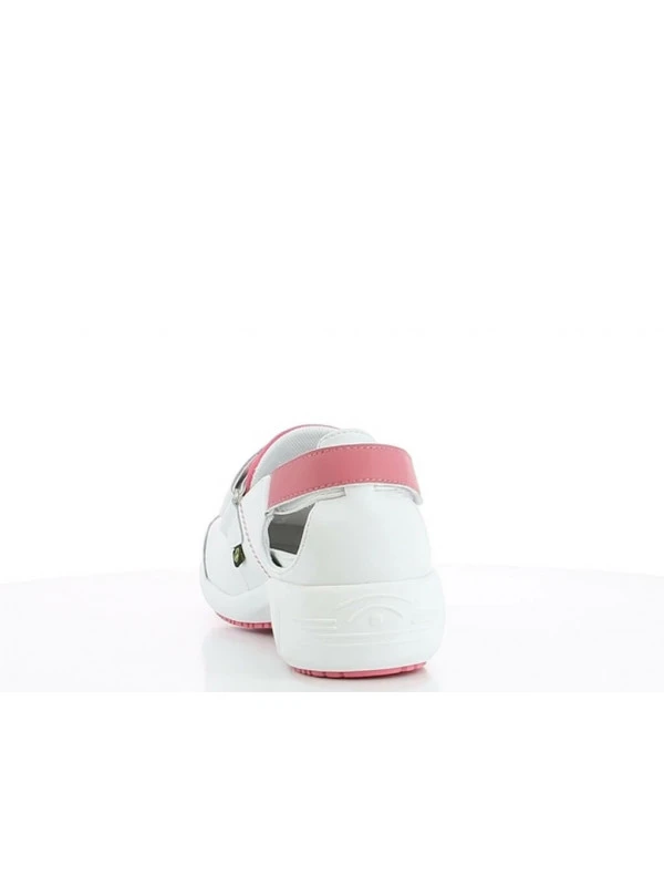 Ce modele SALMA de couleur blanche et rose est une chaussure à talon qui est à la fois élégante, confortable et fermée et correspond ainsi à tous les besoins des professionnels de santé. Deux brides réglables en velcro au-dessus et à l?arrière de la chaussure vous assurent un excellent maintien du pied. Pourvu d?un contrefort fermé pour vous garantir une protection et une sécurité maximale. La languette douce en lycra au niveau de la cambrure protège le pied contre le frottement et l?irritation. La gamme Move Up représente un concept ultraléger pourvu de caractéristiques antistatiques et d?une semelle antidérapante. La doublure en Coolmax® garantit une évacuation optimale de la transpiration. L?extérieur conçu en cuir est facile à nettoyer avec un chiffon humide. La semelle anatomique vous offre un excellent maintien pour un pied sain. Pourvu d?un talon de 4 cm.