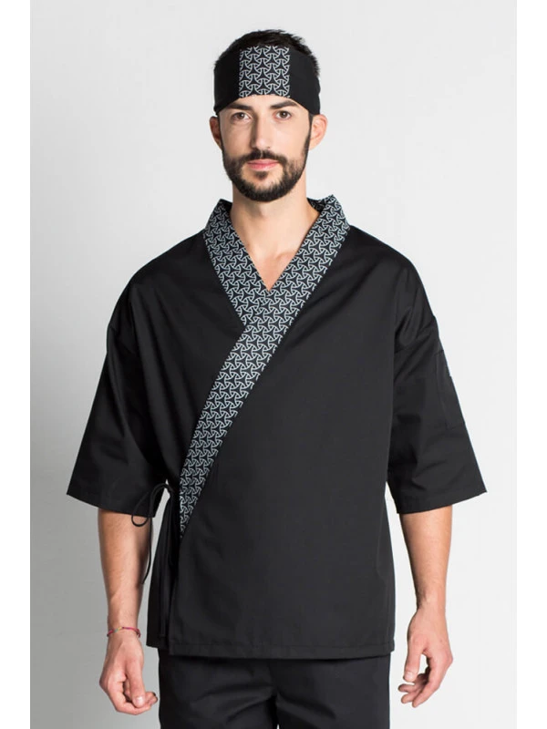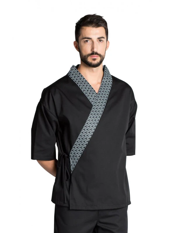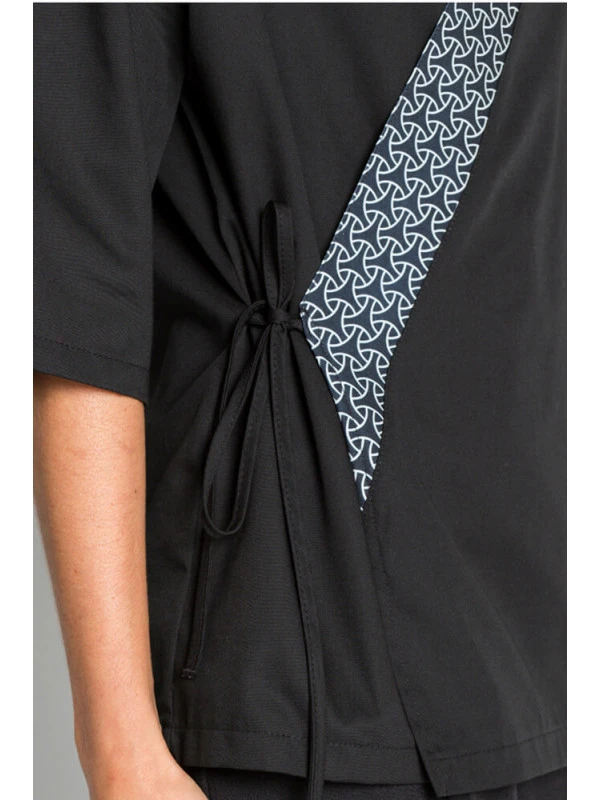 La tunique Kimono cache-coeur noire est l?une des blouses professionnelles les plus choisies par nos clients et nos clientes du monde la restauration. Vous travaillez dans un restaurant prestigieux, procurez-vous de cette blouse kimono de service en salle, noire aux motifs blancs afin de révéler votre personnalité et votre beauté dans le monde professionnel.