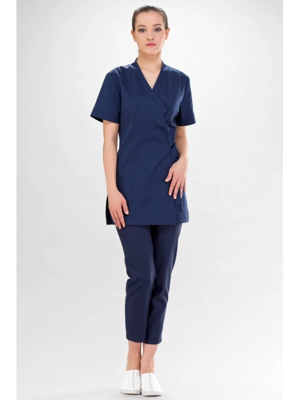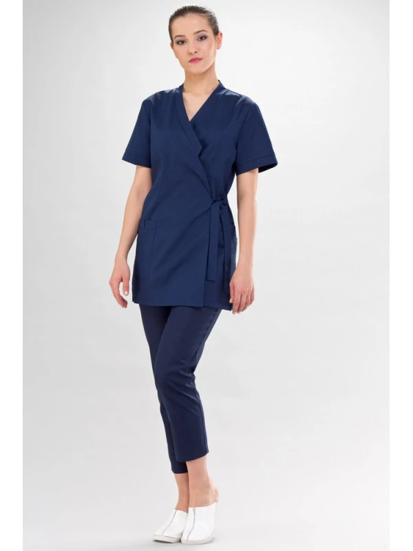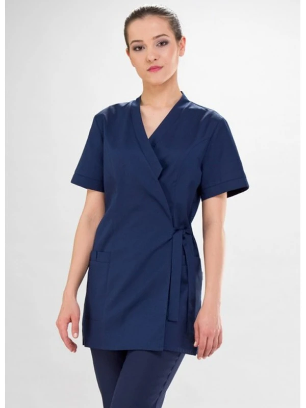 Ce Kimono médical de couleur bleu marine vous habille avec chic et élégance, tout en dessinant votre silhouette. Sa coupe offre le maximum de confort pour travailler en cabinet, ou pour les massages en cabine. Ce Kimono médical posséde une encolure en V avec une doublure plissé, une ceinture à nouer sur la gauche de la taille, deux poches basses, des manches amples et deux fentes sur les cotés