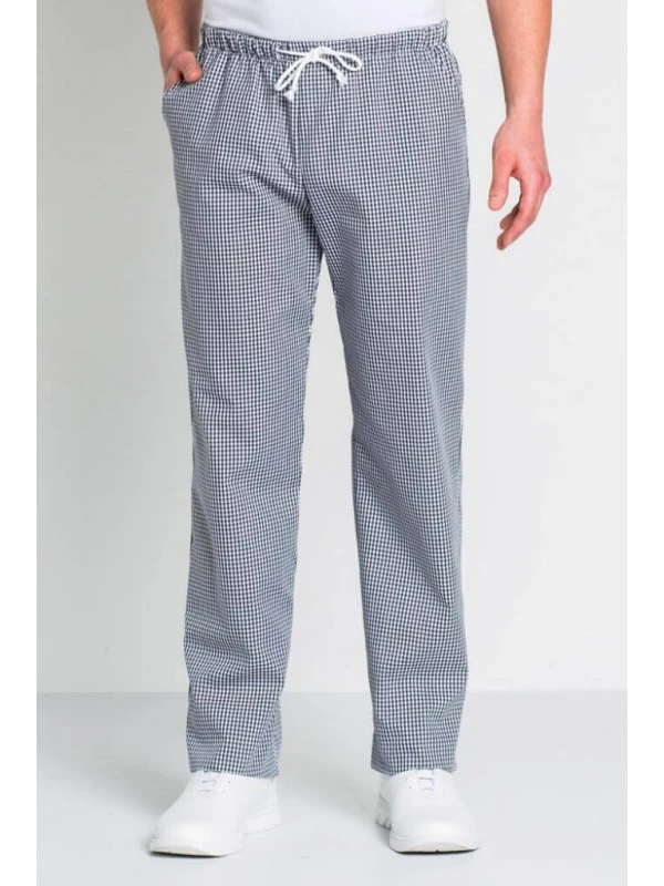 Pantalon Knight avec poches latérales, attaché à la taille par un cordon. Fabriqué dans un imrpimé en vichy bleu marine et blanc. Confort, léger, agréable à porter pour travailler en confort et excercer votre métier avec plaisir.
