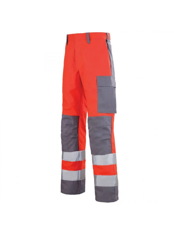 Ceinture droite fermée par bouton caché Braguette fermée par pressions plastiques noires cachées 2 poches italiennes 1 poche revolver à rabat 1 poche cuisse à rabat et à soufflets 1 poche mètre à rabat Poches genoux adaptées à la norme EN 14404 : 2 niveaux de réglage en hauteur, avec ouverture facile par le bas Bandes rétro-réfléchissantes non-feu autour des jambes. Mercerie tout plastique.