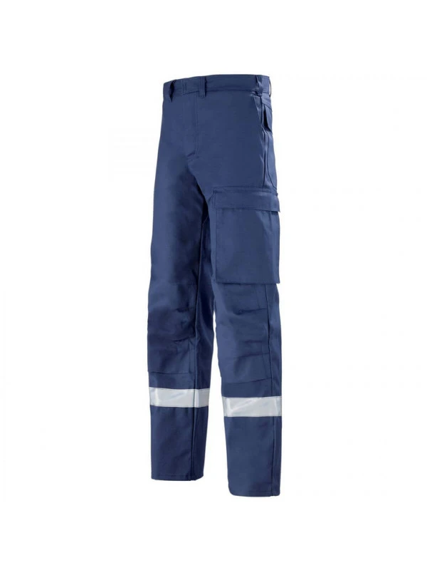 Braguette à pressions plastiques cachées Ceinture droite fermée par bouton caché 7 passants 2 poches italiennes 2 poches arrière à rabats fermés par pressions cachées 1 poche cuisse à soufflets 1 poche mètre à rabat fermé par pression cachée Poches genoux adaptées à la norme EN 14404 : 2 niveaux de réglage en hauteur, avec ouverture facile par le bas Bandes rétro-réfléchissantes non-feu autour des jambes Mercerie tout plastique.