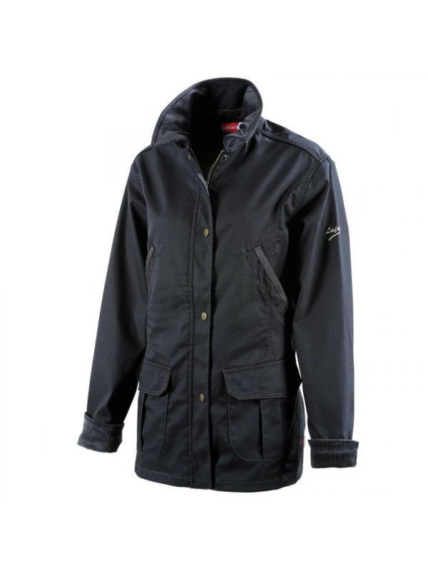 Col montant avec patte d’ajustement Fermeture centrale zippée et sous-patte fermée par pressions vieux laiton 2 poches repose-mains 2 poches basses à rabat fermé par 2 pressions cachées Pattes de serrage cotés au niveau de la ceinture réglables par pressions Intérieur poignets et dessus de col en velours Dessous des rabats, fonds de poche, poche intérieure et panneau dos intérieur en tissu imprimé Lafont Broderie Lafont sur manche gauche.