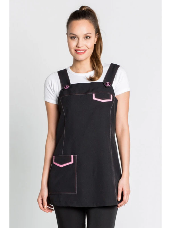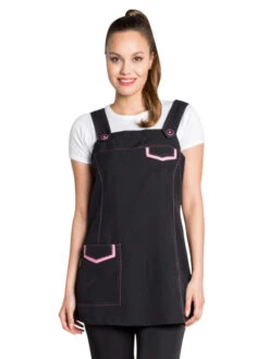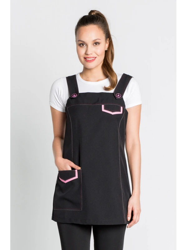 Robe Tablier Jumper noire aux contrastes roses sur les revers et les sangles pour le commerce et l’esthétique. Fermée avec fermeture à glissière invisible sur la couture latérale.