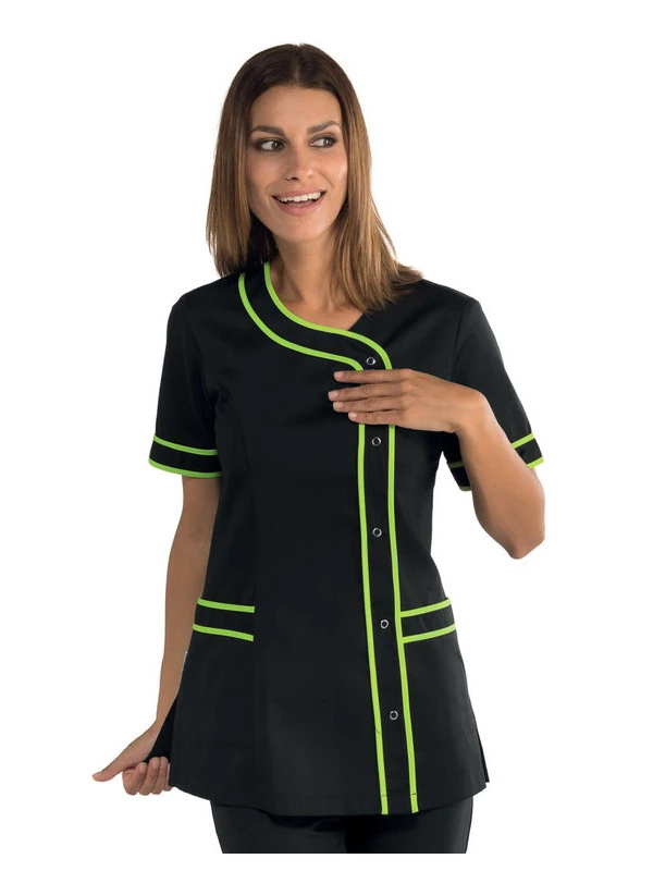 Cette tunique de travail noire et verte pour femme se distingue par sa coupe orginale et moderne. Légère et confortable à porter, elle s’enfilera rapidement grâce à ses boutons pression