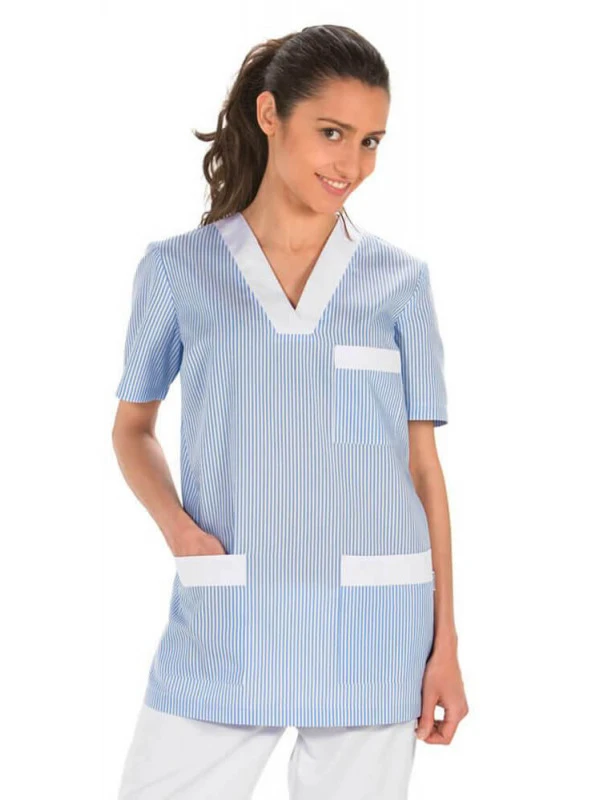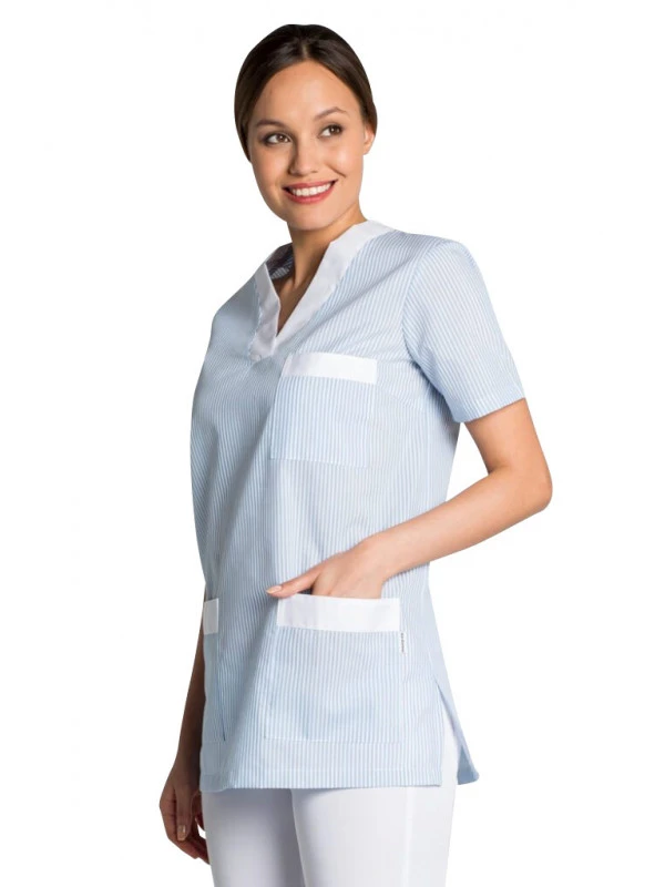 Tunique de travail femme à manche courte bleu et blanc