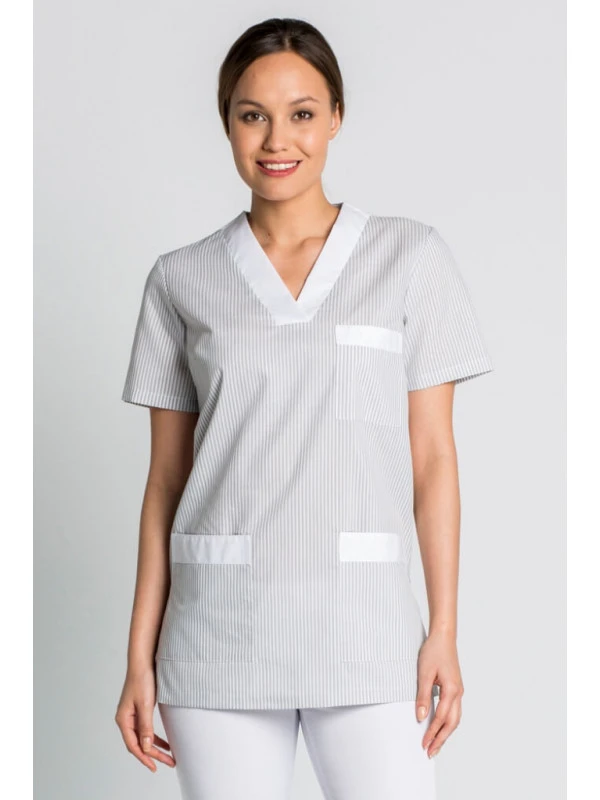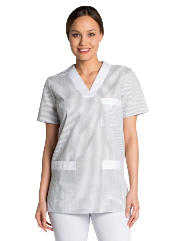 Cette tunique médicale à enfiler est l’un de nos basiques qui doit équiper votre dressing professionnel. Elle vous offrira un look professionnel avec son col en V et ses rayures grise et blanche. Coté pratique, cette tunique médicale est équipé de deux poches basses et une poche poitrine pour faciliter le rangement de votre matériel. Légère et confortable à porter. Cette casaque médicale, vous apporter un coté stylé et moderne