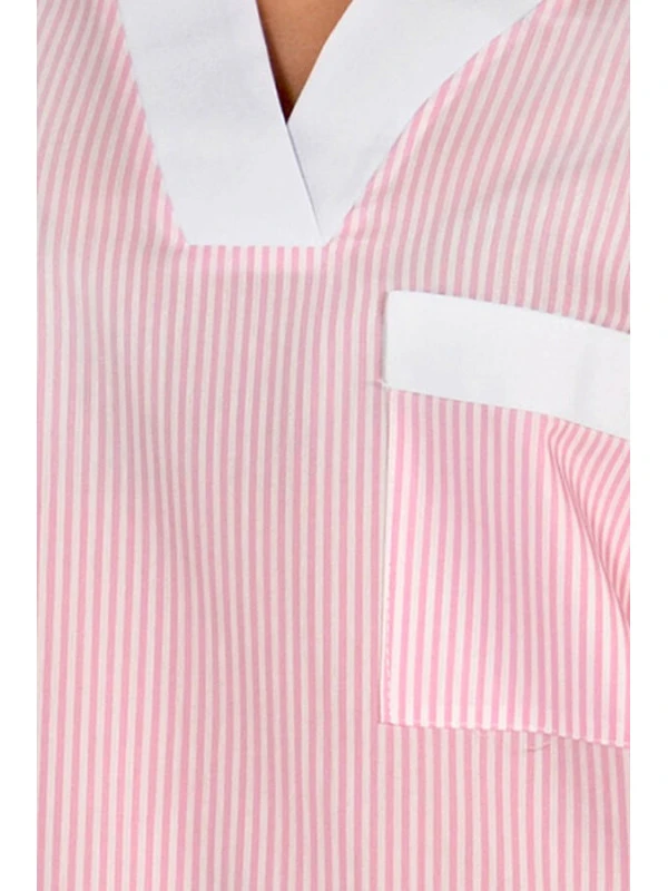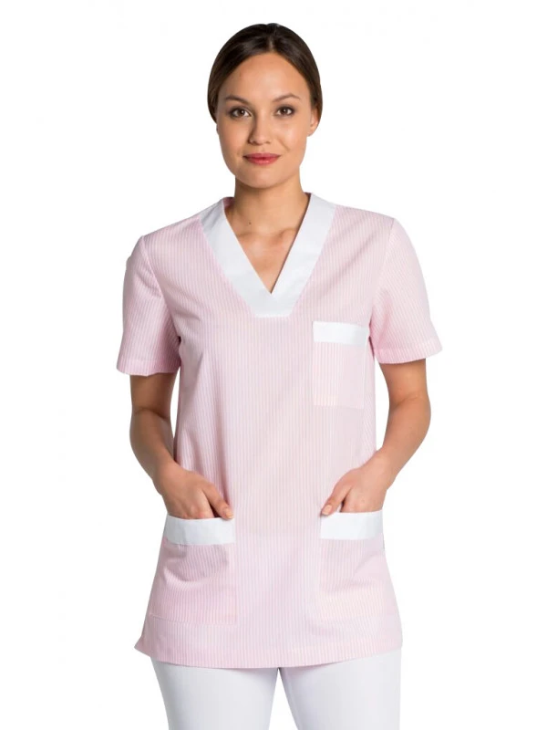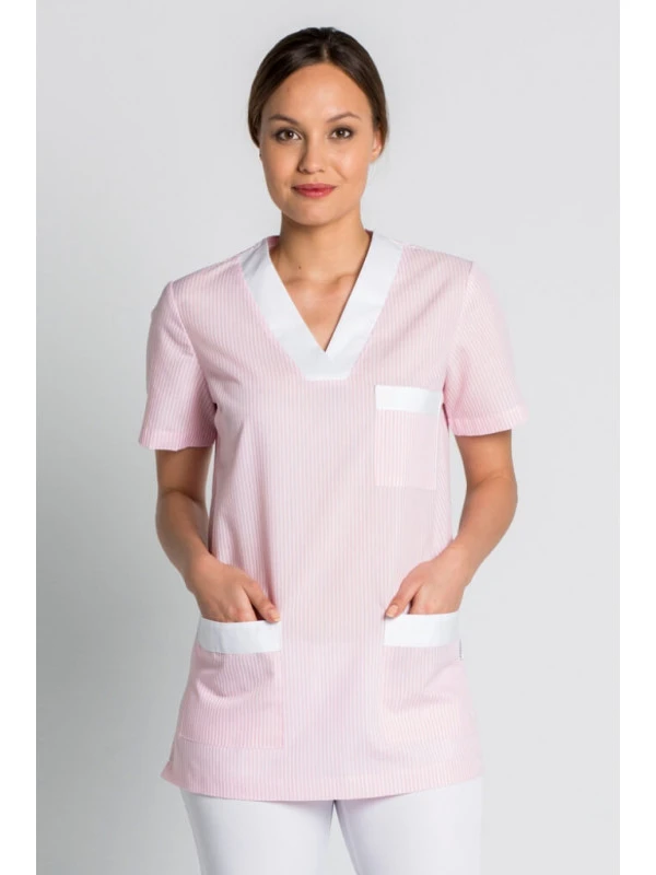 Cette blouse médicale à enfiler est l’un de nos basiques qui doit équiper votre vestiaire professionnel. Elle vous offrira un look professionnel avec son col en V et ses rayures rose et blanche. Coté pratique, cette tunique de travail est équipé de deux poches basses et une poche poitrine pour faciliter le rangement de votre matériel. Cette casaque médicale posséde un trés joli motif de rayure avec une fintion de parments blanc au niveau du col et des poches.