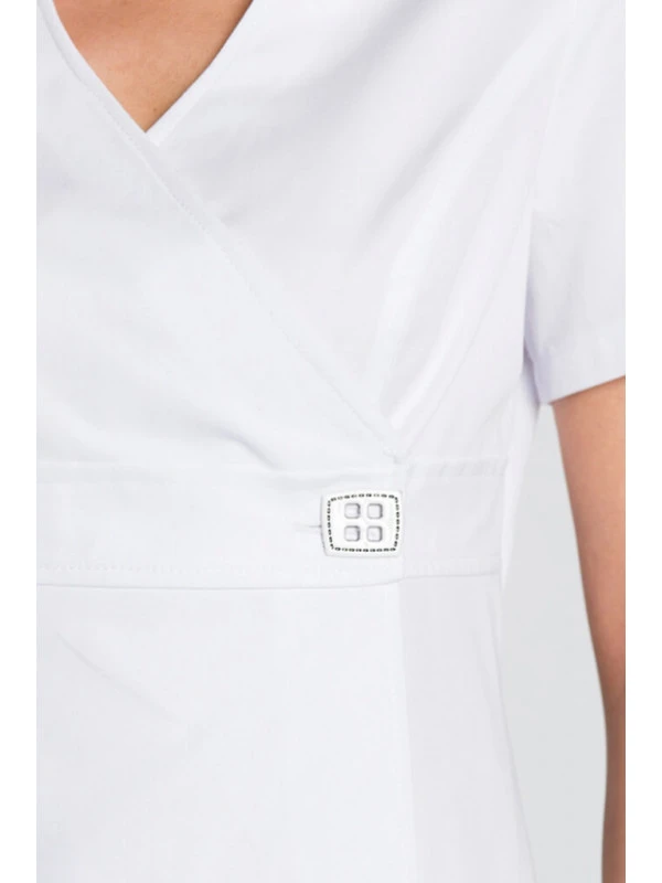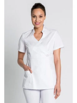 Mylookpro vous recommande cette tunique de travail femme avec un style kimono mode et féminin. La fermeture de cette tunique kimono blanc est composée d’un bouton extérieur et d’une bande intérieure. Les manches courtes permettent une bonne aisance des mouvements. Cette tunique femme élégante est originale et tendance grâce à sa découpe. Cette veste blanche de travail est idéale pour différents métiers : aussi bien tunique d’esthéticienne que tunique de pharmacienne, ou encore en spa, massage, dans les métiers de la santé, en clinique et hôpital par exemple.