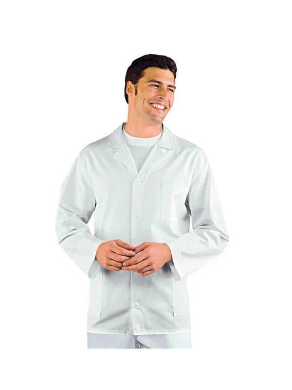 ? Boutons pression cachés. ? 65% polyester et 35% coton 195gr/m2 ? 3 poches ? Traitement anti-acide ? Couleur blanche unie ? Entretien : Lavage à 60°C. Séchage possible à 60°c maximum.