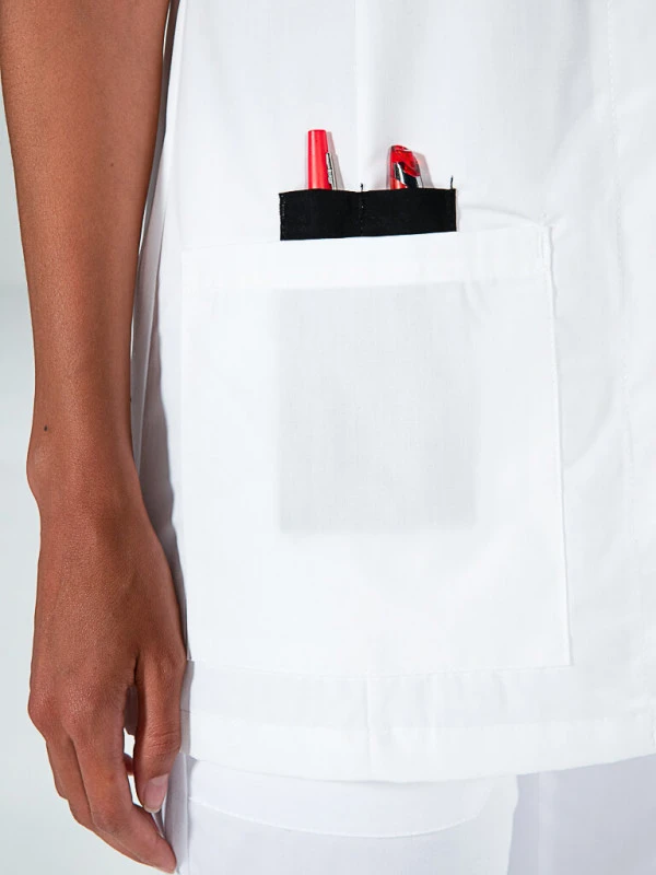 Sa découpe féminine et pratique lui permet de se porter aisément comme tunique en milieux médical, comme tunique médecin, tunique infirmière, tunique aide-soignante…
