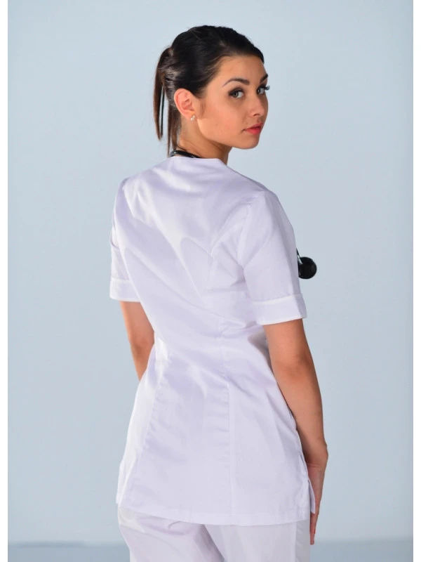 Notre blouse médicale Clinic look est une blouse blanche femme chic. Cette blouse infirmière est à manches courtes. La tunique infirmière est 65% polyester, 35% coton. Cette blouse infirmière pas cher est destinée au personnel médical. Elle a un col rond et est très facile à enfiler en tant que tunique médicale car la fermeture est à pression intégrale. Elle est donc non seulement confortable mais en plus elle est class.