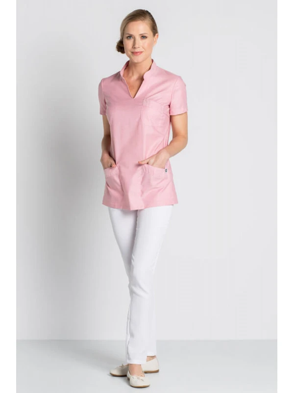 Encolure Col Mao avec encolure en V, manches 1/4, couture amincissantes, 2 poches basses sur le devant et une poche à la poitrine, fentes de cotés, long. dos taille S env. 71 cm. 100% Coton, lavage à 60°