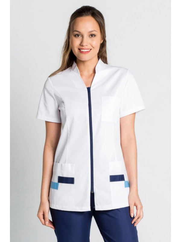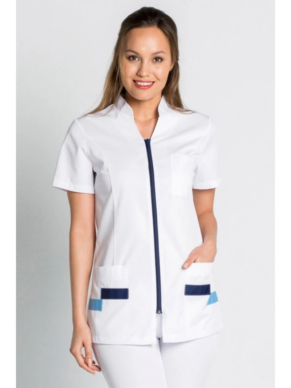 Très jolie tunique médicale femme à au style féminin et mode. Le col mao est ravissant et contemporain. La fermeture de cette tunique profesionnelle est centrale, grâce à une fermeture éclair, pratique et efficace. Les deux poches ont des touches de bleu clair et bleu foncé, donnant de la couleur à cette tunique médicale blanche. Sa découpe originale et élégante se portera aisément en tunique médicale en milieux médical, en pharmacie, également comme tunique de kinésithérapeute, etc…