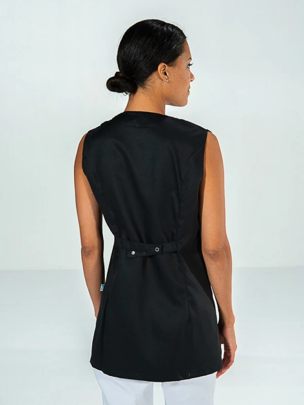 Cette tunique médicale sans manches possède une belle encolure goutte féminine au détail gris clair. Les deux poches basses sont idéales pour ranger des stylos et un téléphone, ayant un compartiment à cet effet. Cette tunique noire possède également une poche sur le coeur. Au dos, se trouve une patte réglable pour ajuster et ceintrer votre tenue de travail.