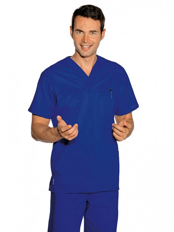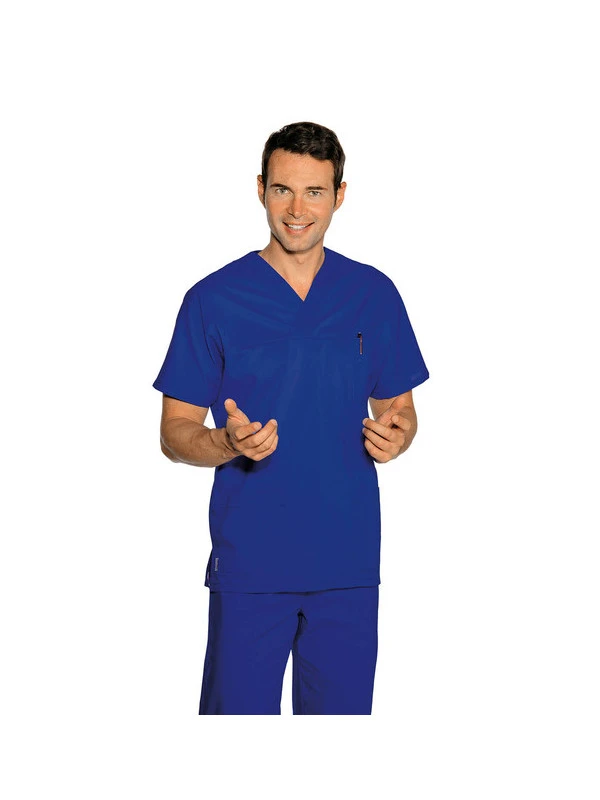 Cette tunique médicale mixte représente la tenue de travail parfaite pour tous les professionnels évoluant dans le domaine de la médecine, hospitalier, vétérinaire, dentiste, infirmier et pharmacien. Son col en V, sa coupe casaque et ses manches courtes offrent une grande liberté dans les mouvements, et permettent aux gens qui le portent d?être bien à l?aise en exerçant leur fonction. Ce sarrau médical manches courtes est pourvu de 3 poches plates cousues sur le devant, permettant de garder les essentiels à portée de main. Sa grande légèreté est due à la qualité du tissu avec lequel cette blouse médicale bleue a été confectionnée. Son tissu est composé de 65 % de polyester et de 35 % de coton.