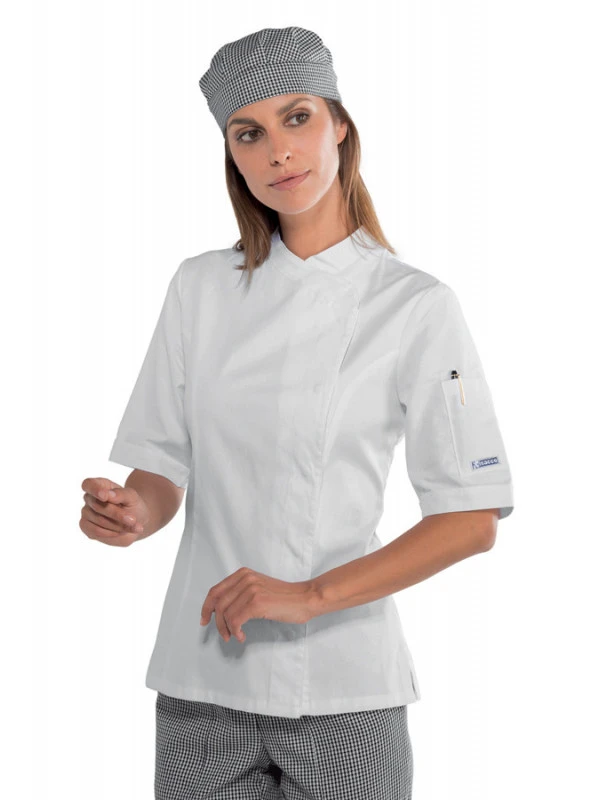 Avec sa coupe cintrée cette veste de cuisine femme est parfaite pour rester élégante au travail.Légère et agréable à porter, cette veste de cuisine femme saura vous mettre en valeur tout en restant confortable !Pratique avec ses boutons pressions et sa poche stylo sur le bras gauche, cette veste de cuisine femme blanche manches courtes se portera aussi bien devant les fourneaux que lors de vos visites en salle.