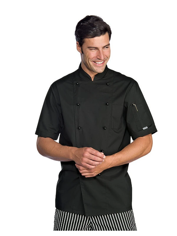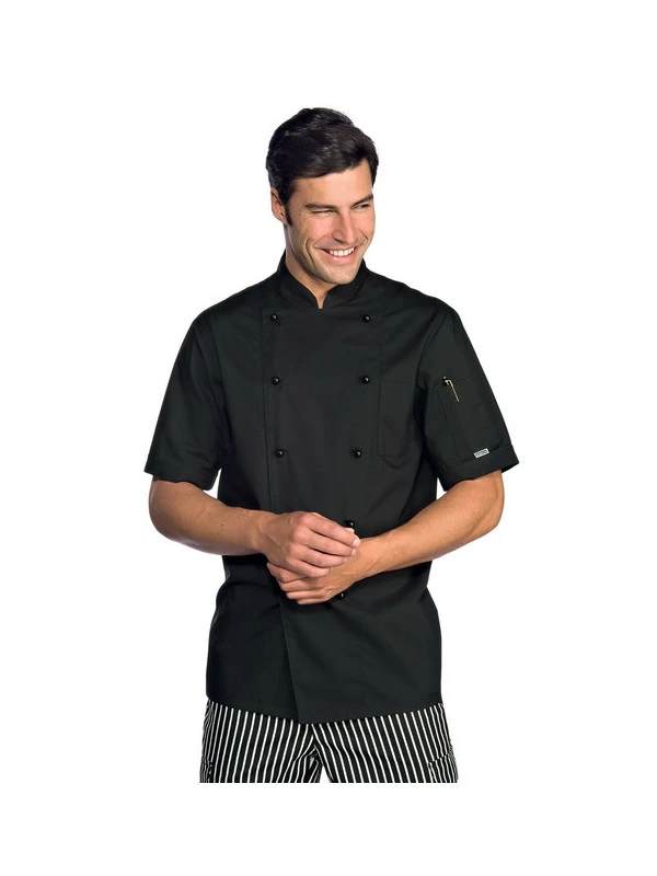 Cette veste de cuisine noire à manches courtes, est idéal à porter pendant les fortes temperatures