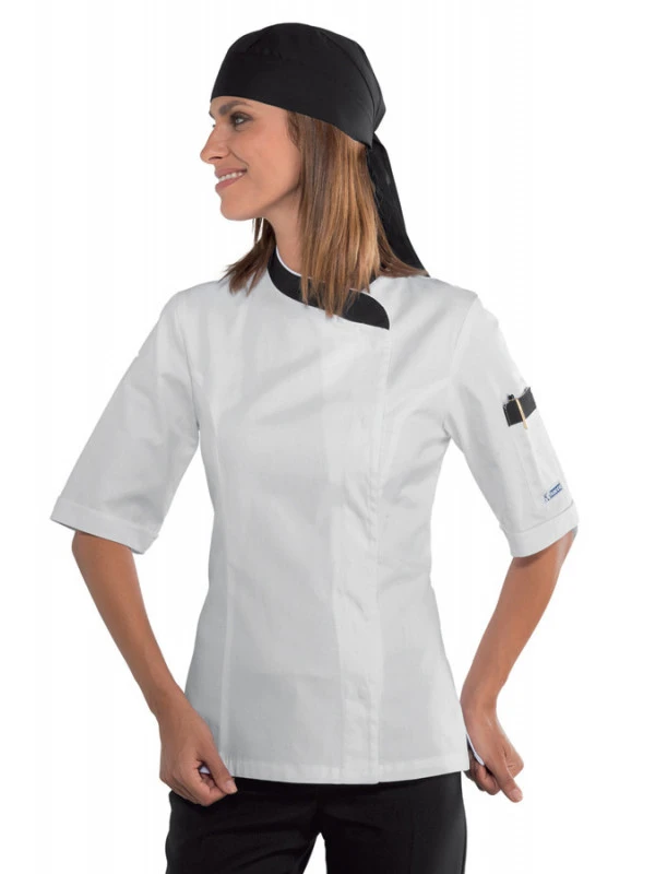 Veste de cuisine pour femme, manches courtes, blanche et noire 100% coton.
