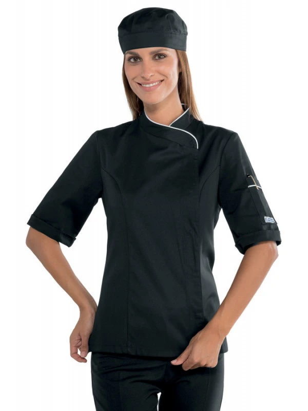 Veste de cuisine femme, manches courte, noire et blanche.
