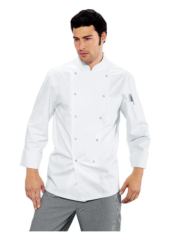 Cette veste de cuisine blanche se ferme et s’ouvre par boutons pressions la rendant trés pratique à l’usage. Coté fintion, cette veste cuisine est équipée d’une poche à la poitrine et d’une poche stylo sur la manche gauche.