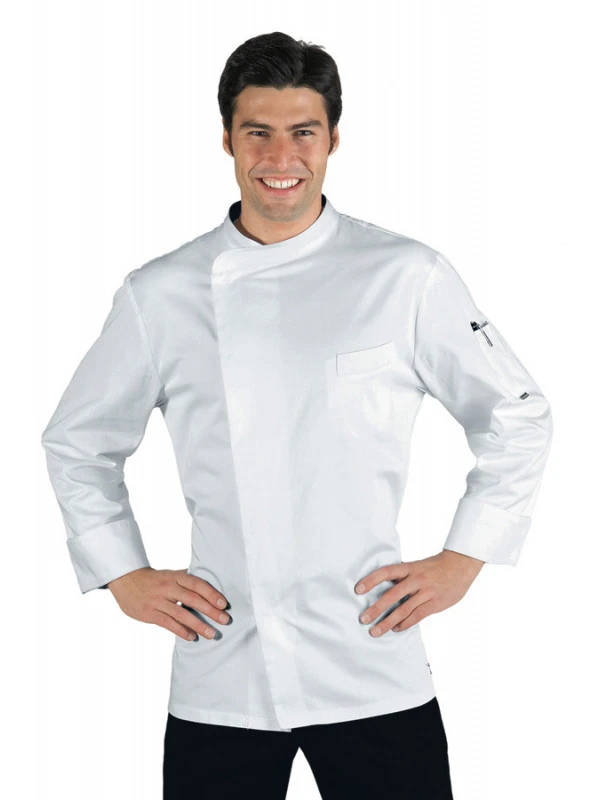 Veste de cuisine blanche, pas cher, Bilbao. Légère et agréable à porter, cette veste de cuisine homme est en polycoton. Facile à repasser, cette veste de cuisine homme résiste aussi à de nombreux lavages.