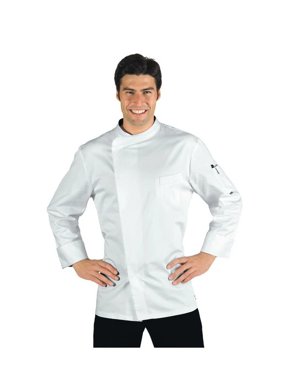 Pratique grâce à ses boutons pressions, cette veste de cuisine homme dispose aussi de deux poches : 1 poche poitrine et 1 poche stylo sur la manches gauche.