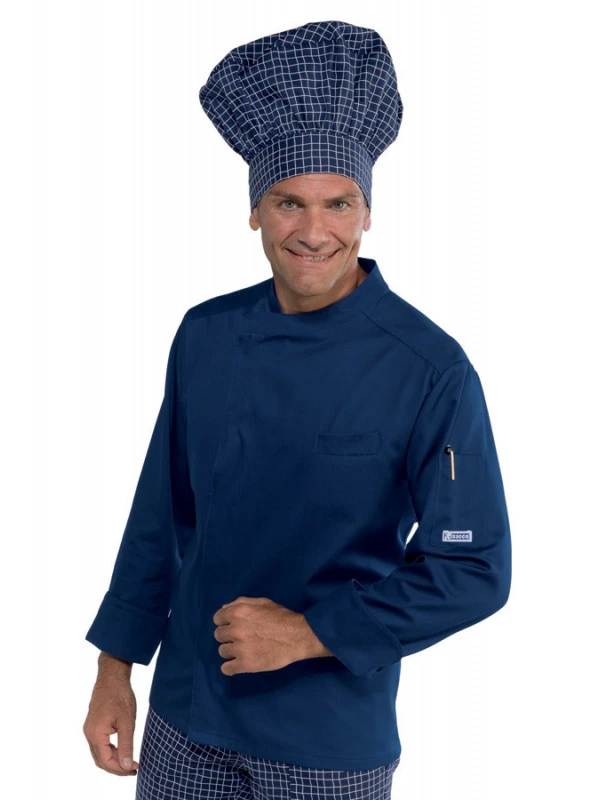 Cette veste de cuisinier de couleur bleue en polycoton avec fermeture à pressions sera trÚs agréable à porter et pratique à la fois.