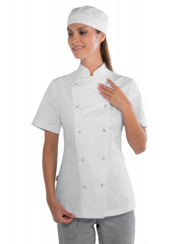 Avec sa coupe cintrée cette veste de cuisine femme est parfaite pour rester élégante au travail.Légère et agréable à porter, cette veste professionnelle de cuisine saura vous mettre en valeur tout en restant confortable !Pratique avec ses boutons pressions, cette veste de cuisine femme blanche manches courtes se portera aussi bien devant les fourneaux que lors de vos visites en salle pour vous présenter à vos clients.