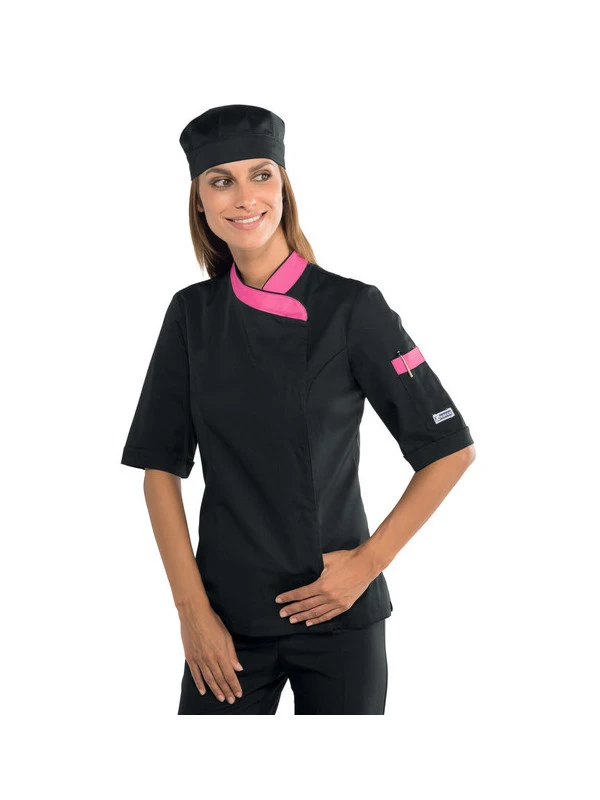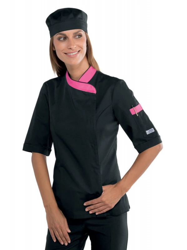 Veste de cuisine pour femme, manches courtes, noire et rose.