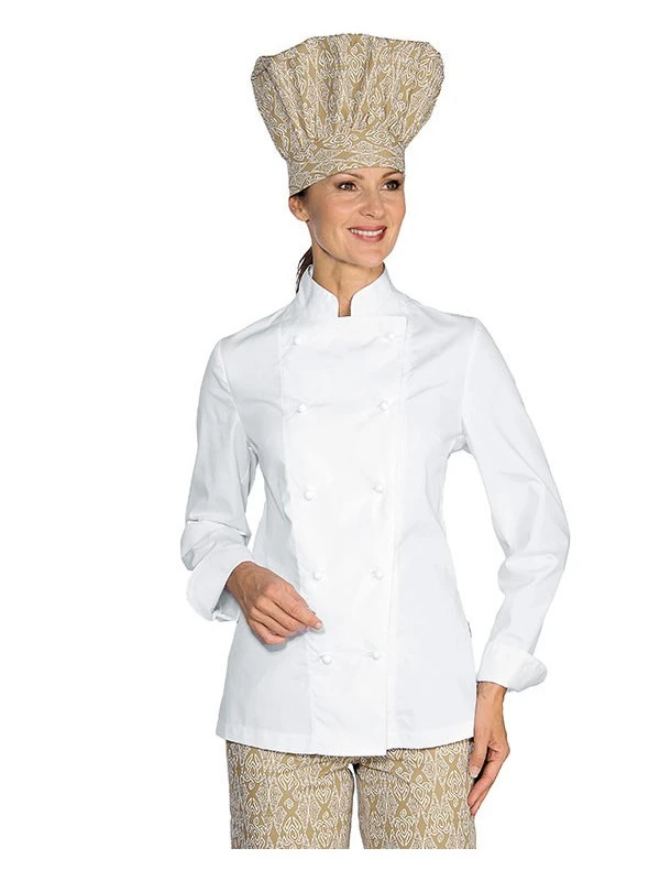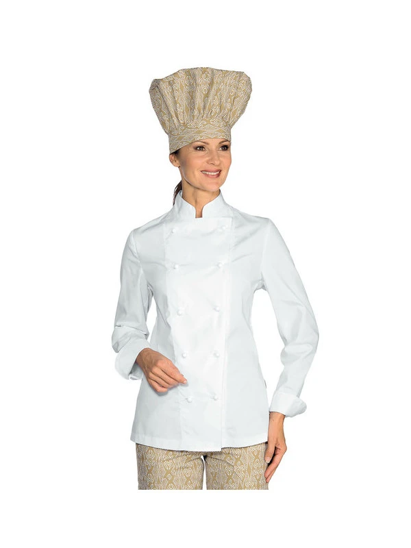 Trés légère à porter cette veste blanche de cuisine femme posséde une coupe princesse cintrée pour rester féminine dans votre cusine.