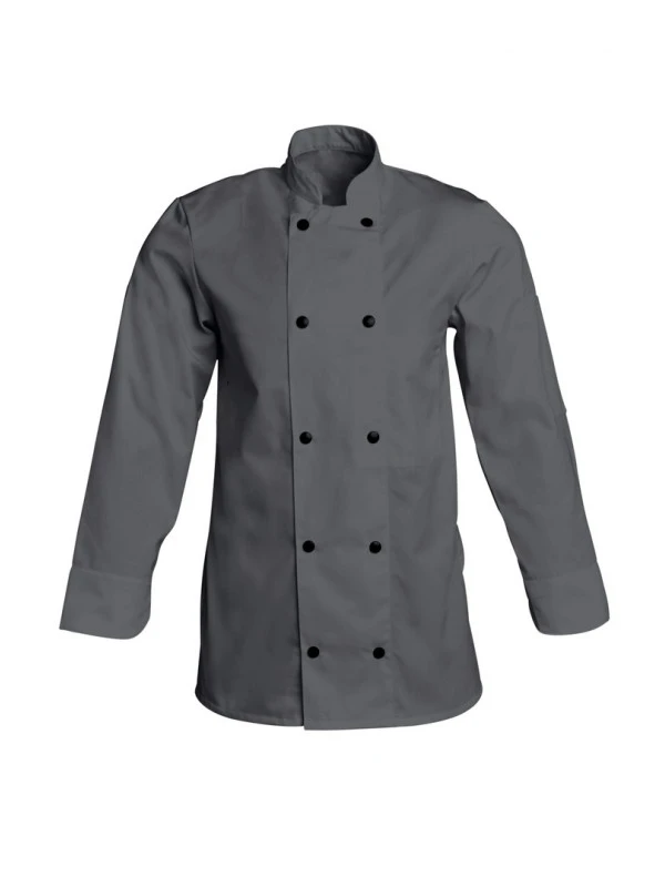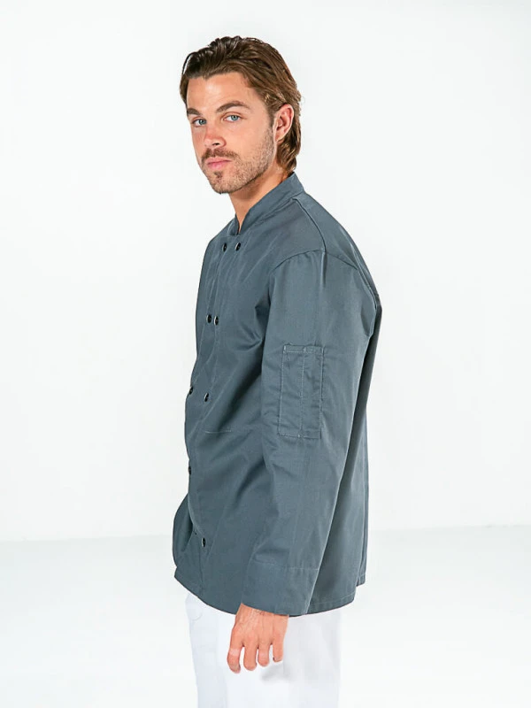 N’attendez plus pour découvrir cette superbe veste de cuisine grise pour homme ou pour femme, avec des boutons noirs pression, pour un joli contraste.