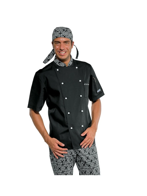 Disponible dans les modèles S, M, L, XL et XXL, cette veste cuisinier été est agrémentée d’une double rangée de boutons, de manches courtes s’arrêtant au niveau du coude et d’un col officier à motifs maori, pour une touche exotique.