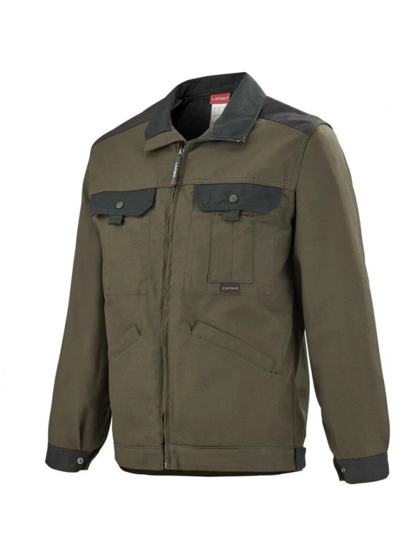 Col montant Fermeture à glissière bord à bord avec sous-patte 2 poches poitrine à rabat contrasté fermé par pression, dont 1 avec surpoche stylo 2 poches paysannes Renforts polyester haute résistance sur épaules et avant-bras Poignets réglables par pressions