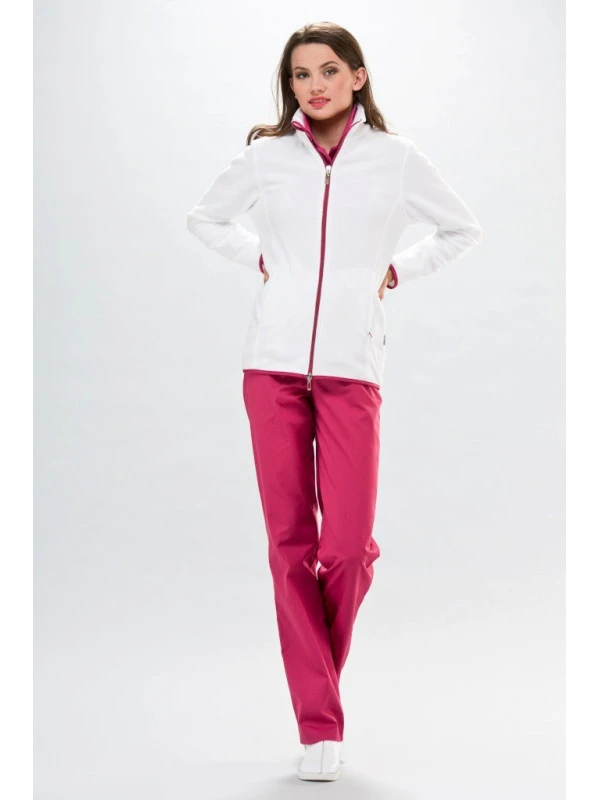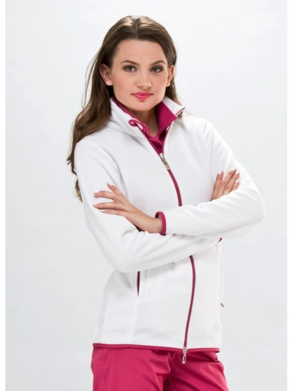 Cette veste polaire pour Infimiere blanche avec finition contrastante rose au niveau de l’encolure, la taille, la fermeture éclair et des manches est idéal pour les saison d’automne, d’hiver ou les fraiches soirées de printemps. Ce passe couloir d’infirmiere est l’un des éléments incontournable de votre vestaire. cette veste passe couloir est ultra réchauffante, Coupe cintrée, manches longues et col haut double fermeture zipée, elle est facile à enfiler et à enlever. 100% polyester, cette veste polaire se lave en machine trés facilement et sans aucun repassage.